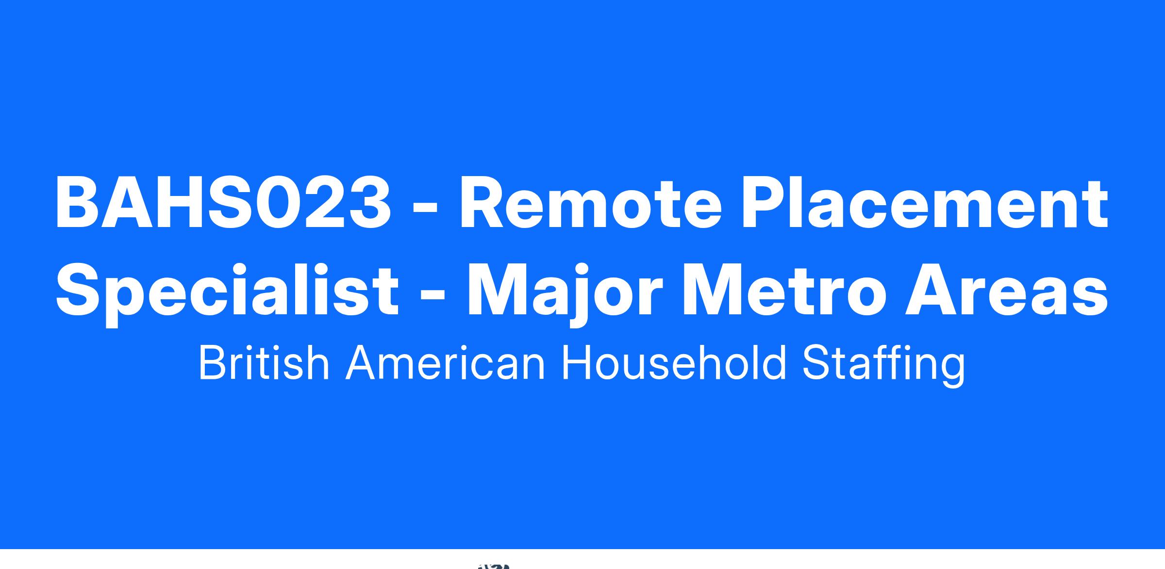 British American Household Staffing is hiring a recruiter/placement specialist to join our team. While this is a remote role we are only considering someone who is local to one of the following major metro areas; NYC, Houston, Austin, Miami, Chicago, Washington DC, Los Angeles, or San Francisco.
