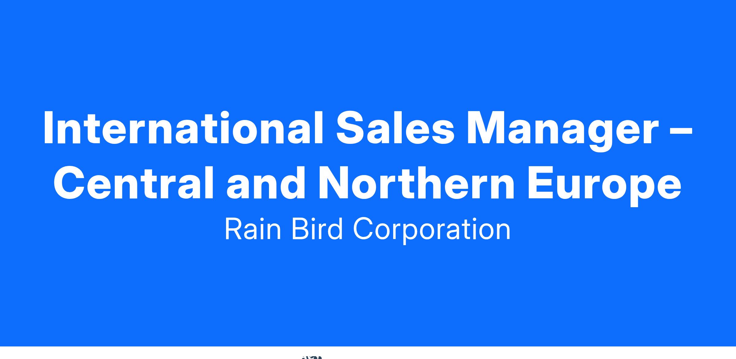 The International Sales Manager – Central and Northern Europe will report directly to Rain Bird Europe’s General Manager and will be responsible for creating and driving sales growth and product strategies for our landscape segment in UK, Benelux, Germany, Switzerland, Austria, Scandinavia, and Eastern Europe North. The succesful candidate will think and plan strategically and will be a key sales leader in the development and execution of the overall Rain Bird Europe’s operating plan. He/she must be collaborative, driven, high energy and have a demonstrated track record of success in both sales and business management. This position will be measured on market top line sales growth and market share growth.