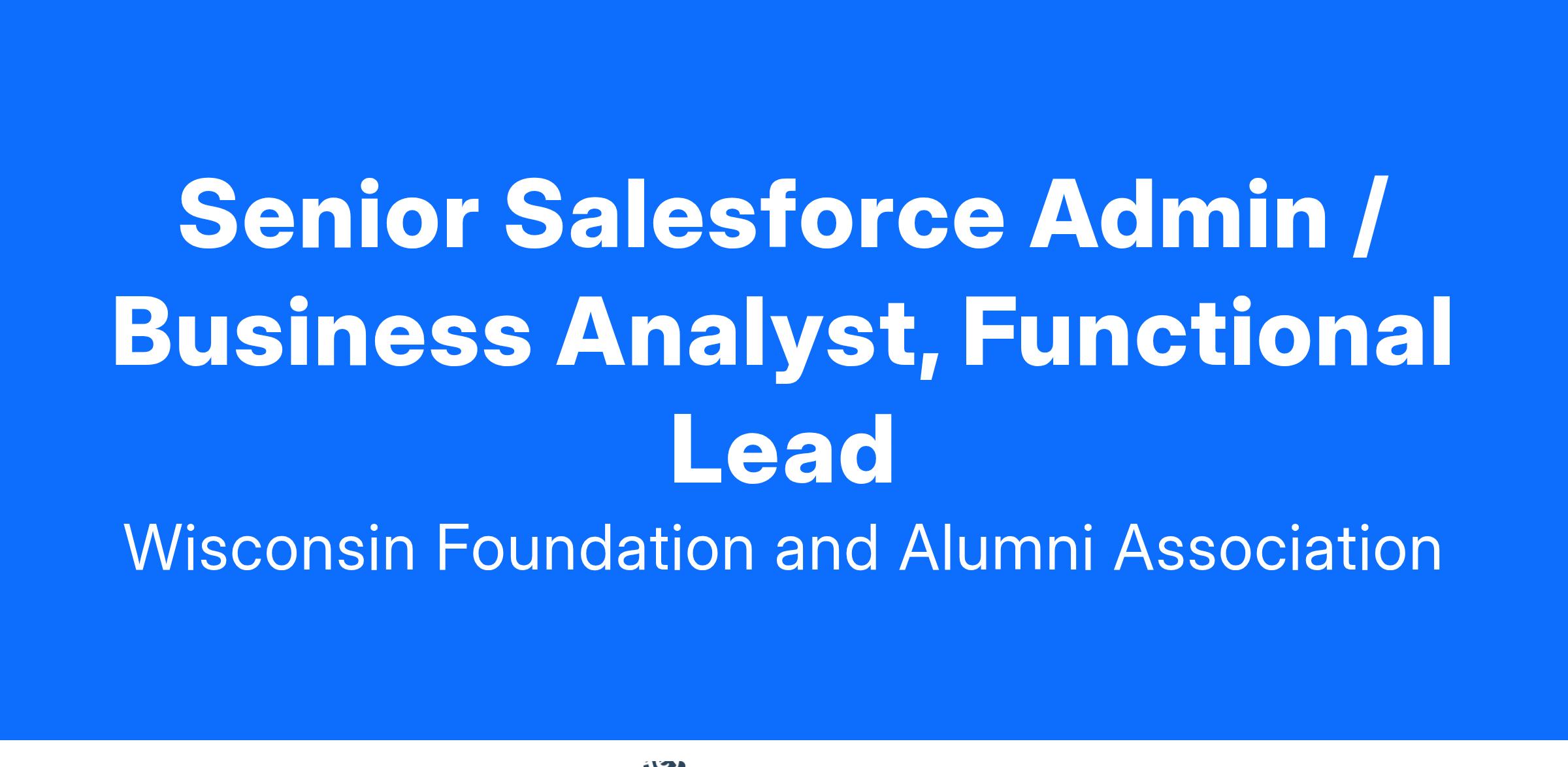The Wisconsin Foundation and Alumni Association (WFAA)* is seeking a highly skilled and dynamic Senior Salesforce Admin/Business Analyst, Functional Lead to play a pivotal role in managing and optimizing WFAA’s CRM ecosystem. This position will focus on identifying, evaluating, and implementing innovative solutions within the Salesforce platform. As a leader, you will develop and enforce best practices for Salesforce administration and business analysis, increase operational efficiency, challenge the status quo, empower team members and users, and ensure data stewardship.